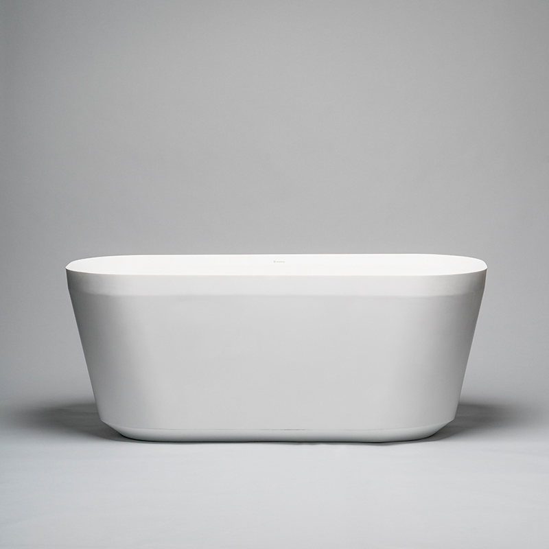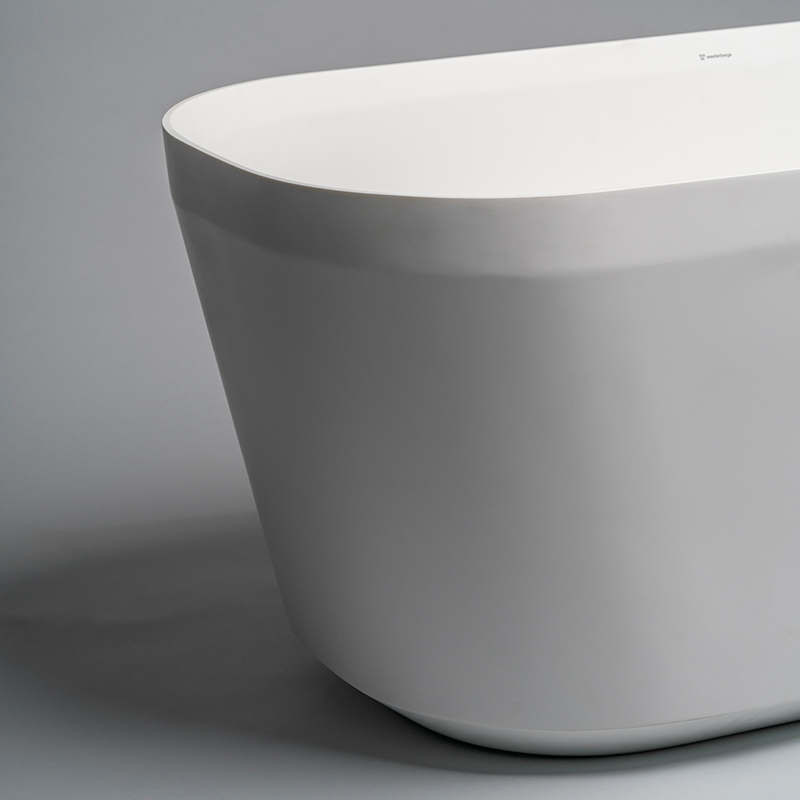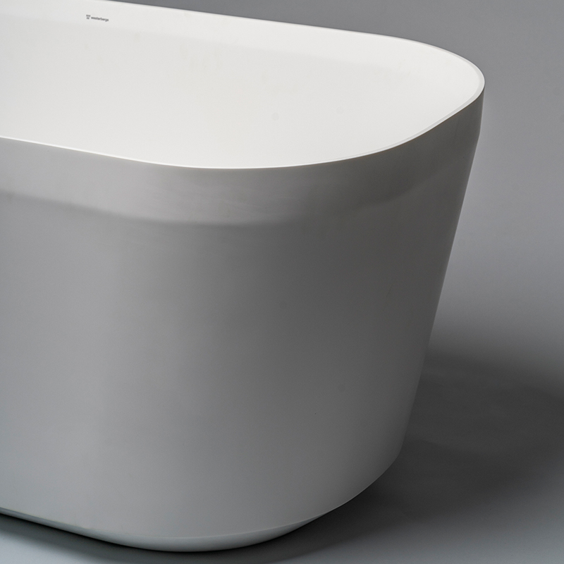 Stilfullt, lätt konformat badkar med en fin fasettslipning upptill och en sidenmatt yta. Varje badkar tillverkas för hand i det naturliga materialet Solid surface. Levereras med kromad bottenventil och avloppsrör.