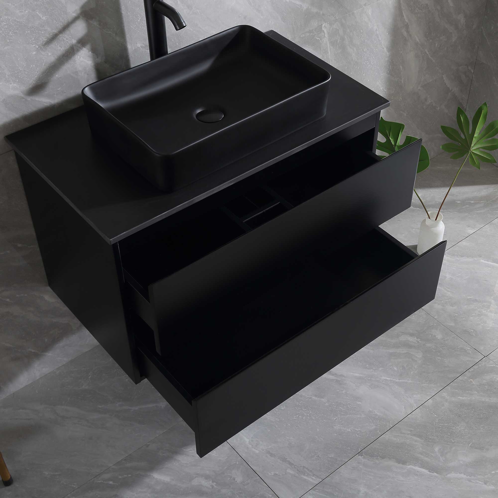 Övre kanten på luckan är snedställd för att lådorna ska vara lätta att öppna. Tvättställskåp Extas finns i flera bredder. Möbeln kommer färdigmonterad.