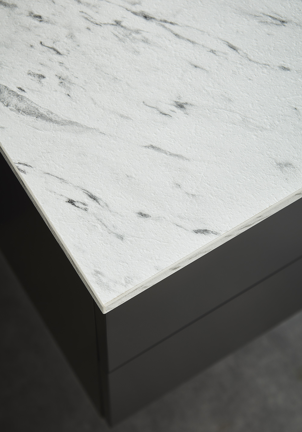 OnTop bänkskivor av laminat. Marmormönstrad. Håltagning utförs av installatören beroende på blandare, handfatsmodell och och val av placering.