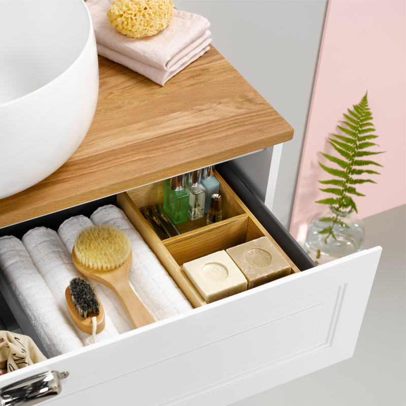 Tvättställsskåp med två lådor. Lådorna öppnas med push open-funktion. Löstagbar lådinsats i ek ingår. Räfflad matta i botten på lådorna gör att saker står på plats. Justerbara upphängningsbeslag för enkel montering. Stommen är färdigmonterad och lådfronterna monteras enkelt vid installation. Tvättställ i porslin med unik form som harmonierar fint med tvättställsskåpets strikta linjer. På båda sidor finns det avställningsytor.