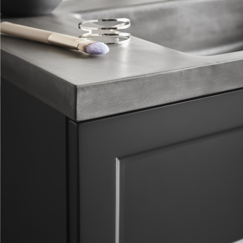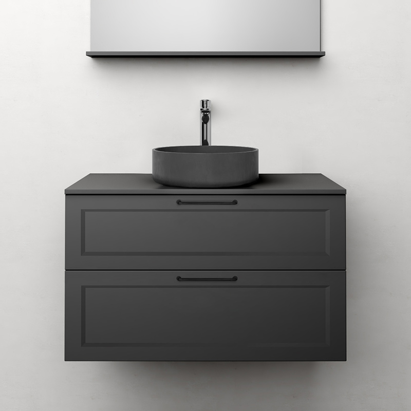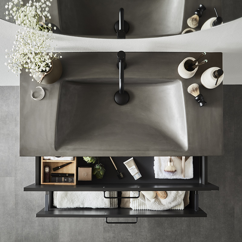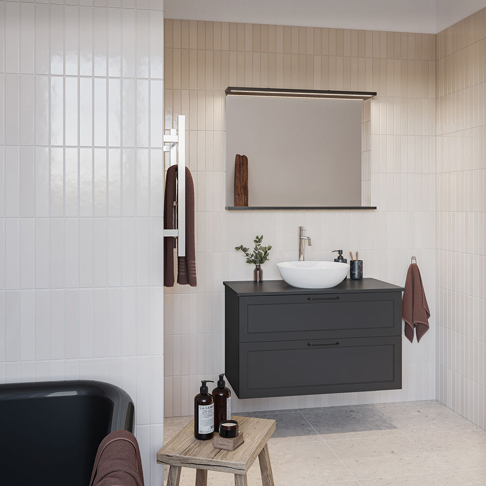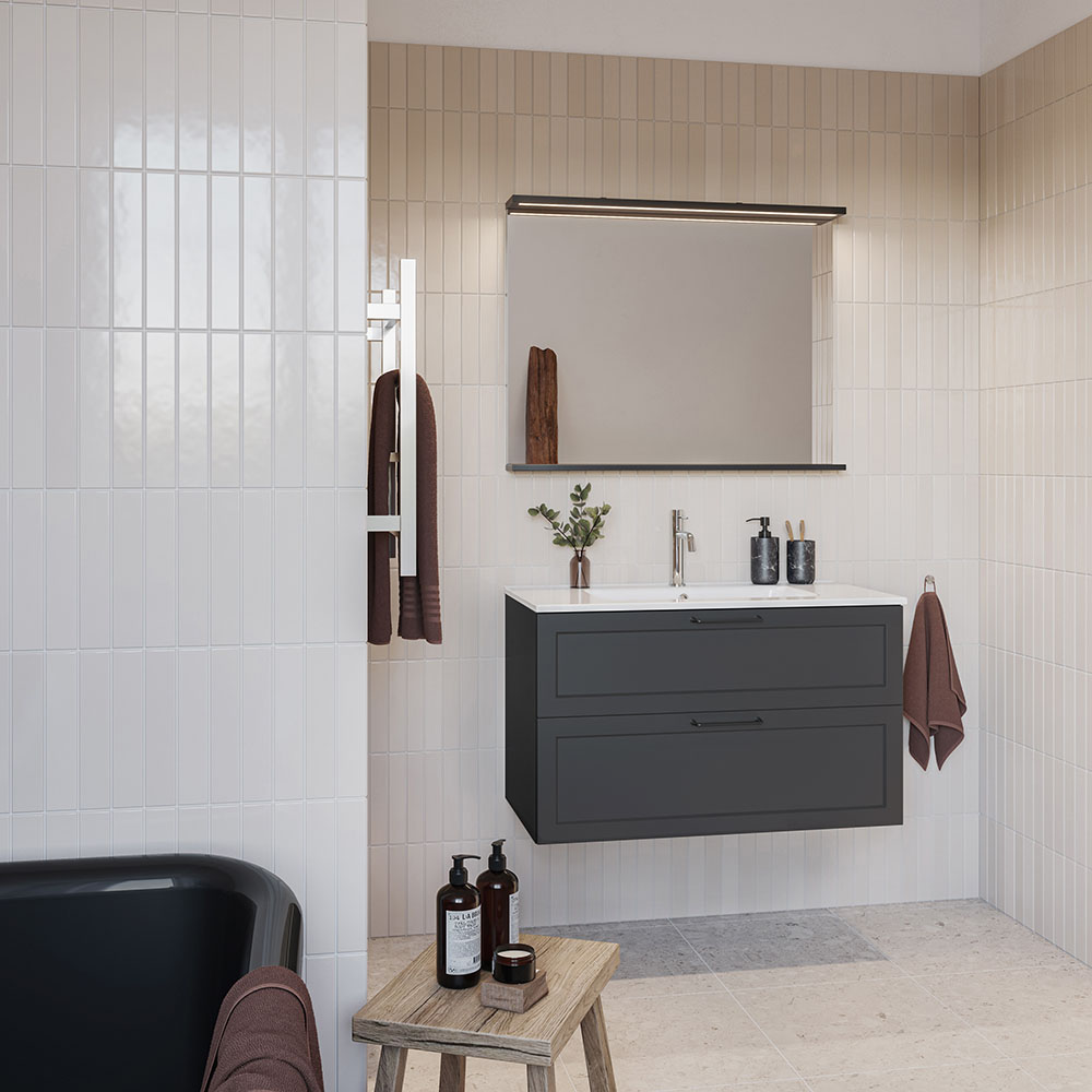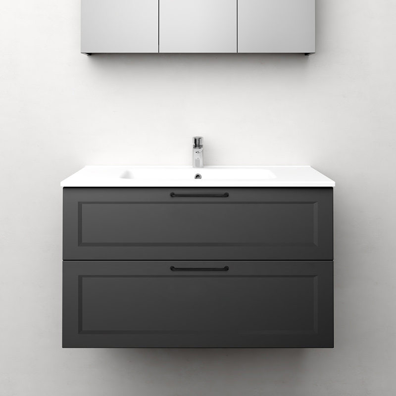 Nejd är en vacker möbel i klassisk stil med ramfronter. Mjukstängande lådor med fullutdrag, lådsidor av metall och urtagbar lådinsats i ek. En urtagbar matta i botten på lådorna gör att saker står på plats samt underlättar vid rengöring. Övre lådan har en U-konstruktion som lämnar utrymme för vattenlås. Möbeln är förberedd för både golv- och väggavlopp och har justerbara upphängningsbeslag. Finns i vit matt och antracit. Vi rekommenderar avloppssats 200 720 00 som tar liten plats i möbeln. Köp till handtag.