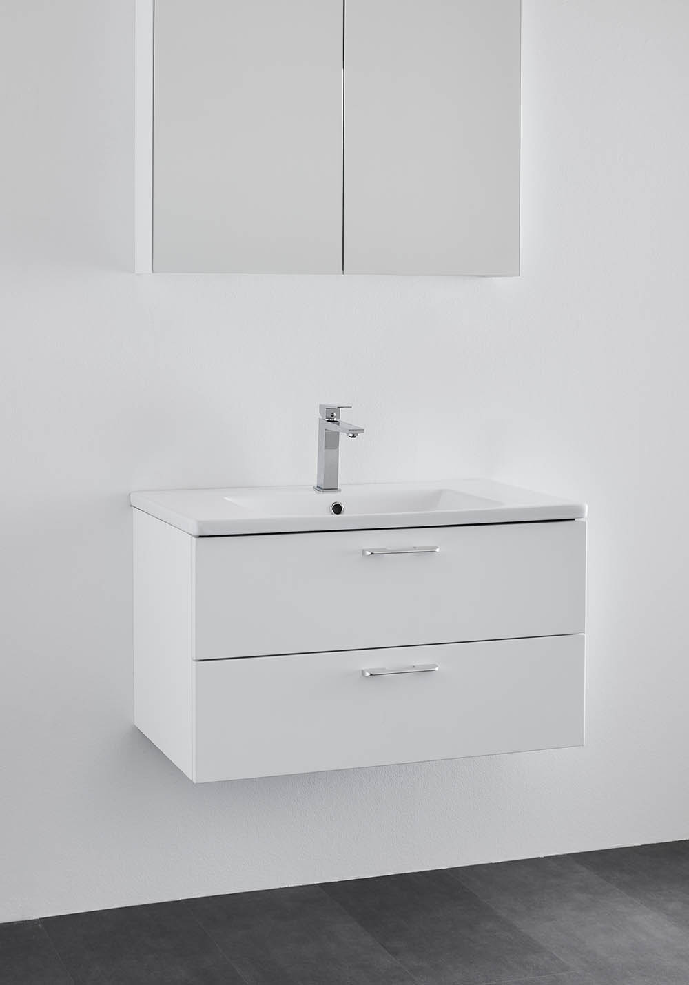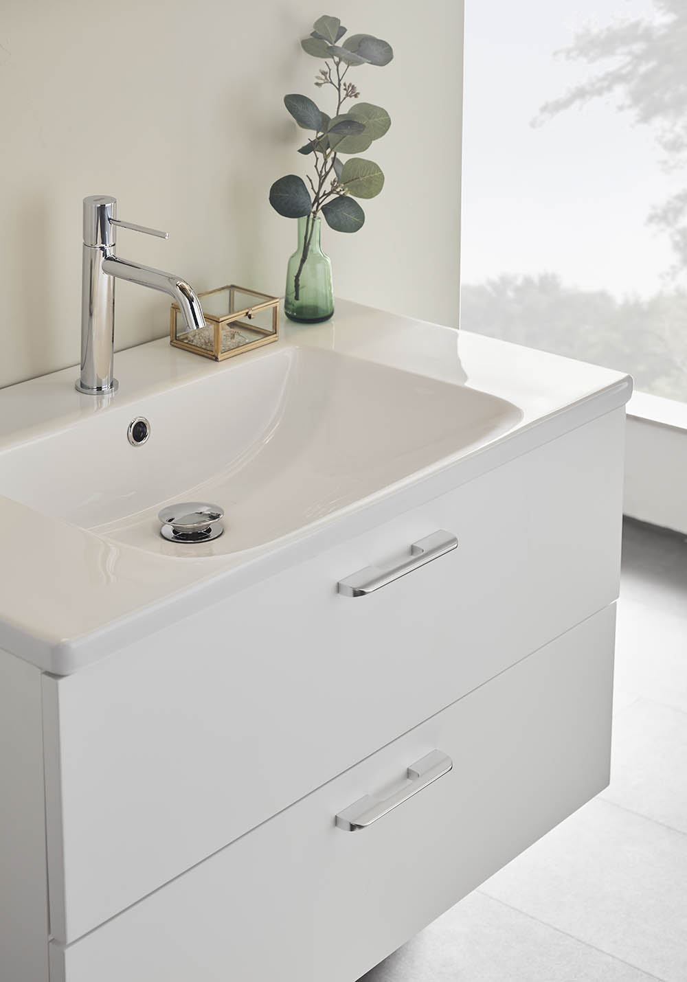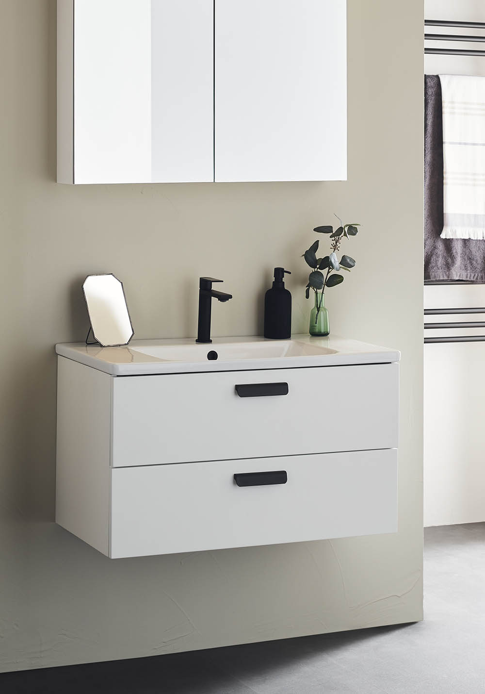 Neo badrumsmöbel med funktioner som en modern kommod förväntas ha. Perfekt för det mindre badrummet. Möbeln finns i klassiskt vit matt, i storlekarna 600 och 800 mm, och har två lådor med fullutdrag och Soft Close-funktion. Lådfronterna är släta och är förborrade på insidan för handtag i storlek CC 128 alternativt centrerad knopp. Du köper de handtag som passar din stil bäst. Välj Neo nedsänkt tvättställ i porslin till din underdel. Lådsidorna är tunna, smäckra i mörk grå. Med sina två matchande lådinsatser i grått tillför den möbeln extra bra förvaring, från stora handdukar till små badrumsartiklar. Möbeln kommer färdigmonterad och monteras på vägg med justerbara upphängningsbeslag för enkel och snabb installation. Förberedd för både golv- och väggavlopp.