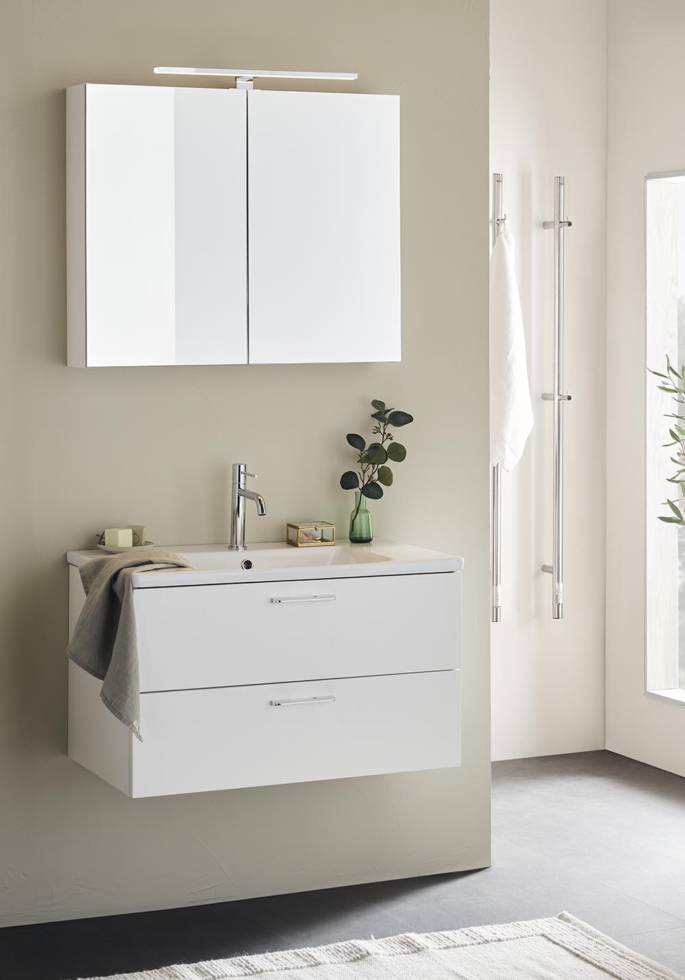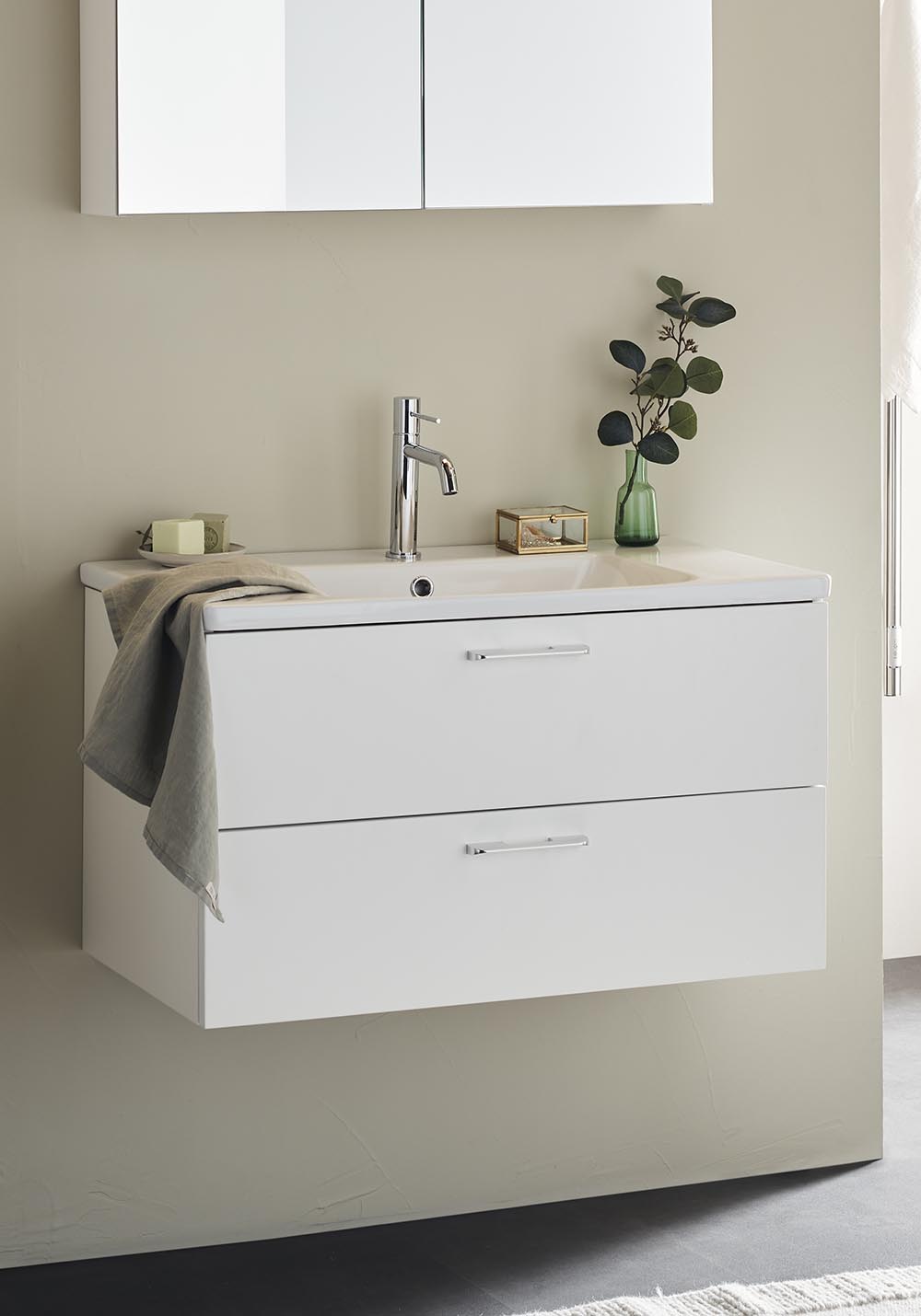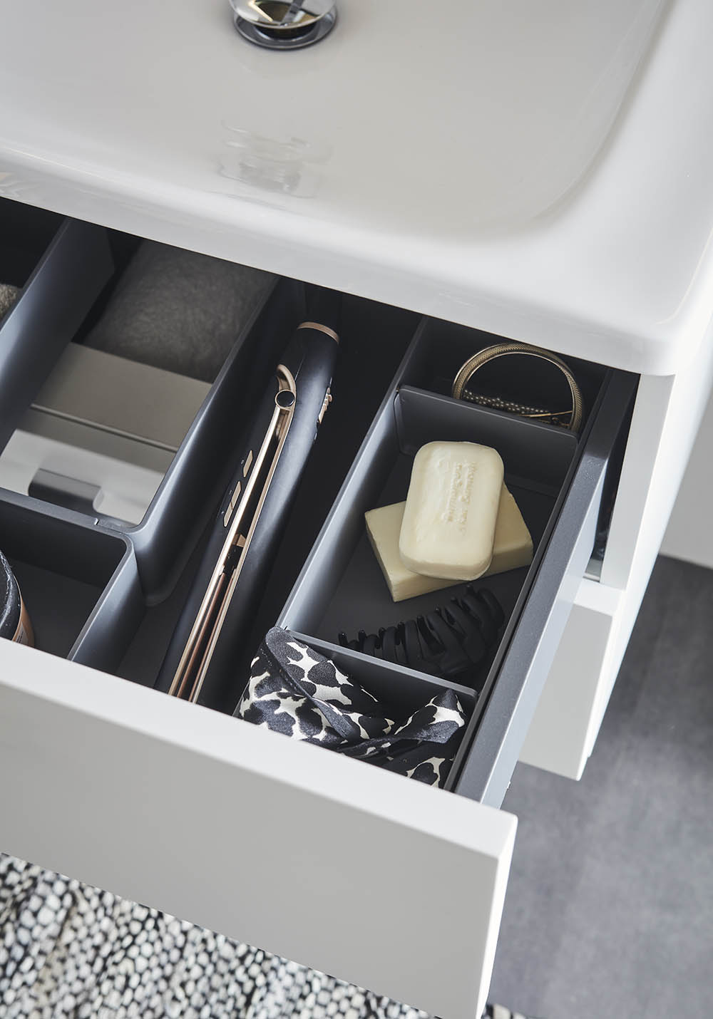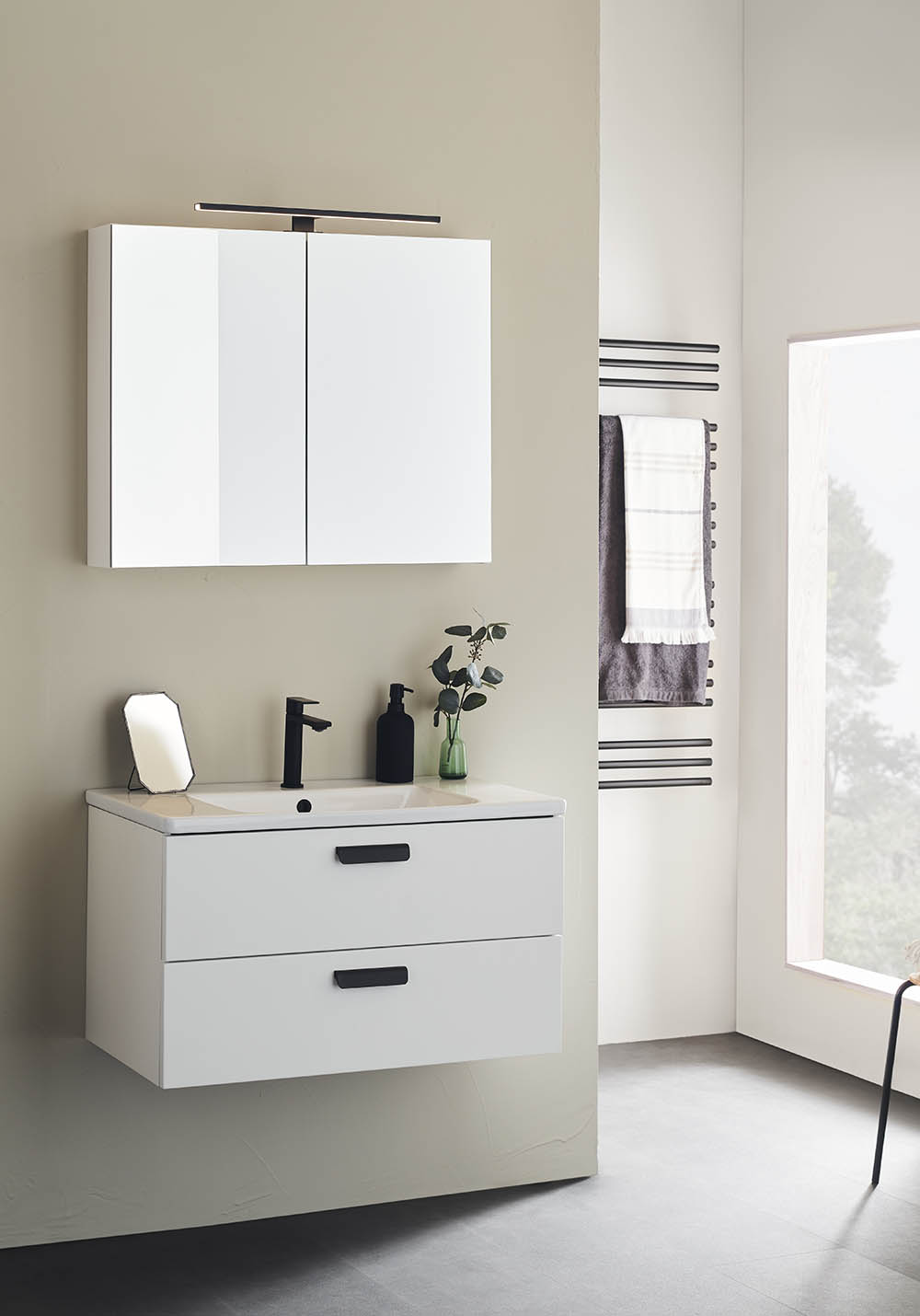Neo badrumsmöbel med funktioner som en modern kommod förväntas ha. Perfekt för det mindre badrummet. Möbeln finns i klassiskt vit matt, i storlekarna 600 och 800 mm, och har två lådor med fullutdrag och Soft Close-funktion. Lådfronterna är släta och är förborrade på insidan för handtag i storlek CC 128 alternativt centrerad knopp. Du köper de handtag som passar din stil bäst. Välj Neo nedsänkt tvättställ i porslin till din underdel. Lådsidorna är tunna, smäckra i mörk grå. Med sina två matchande lådinsatser i grått tillför den möbeln extra bra förvaring, från stora handdukar till små badrumsartiklar. Möbeln kommer färdigmonterad och monteras på vägg med justerbara upphängningsbeslag för enkel och snabb installation. Förberedd för både golv- och väggavlopp.