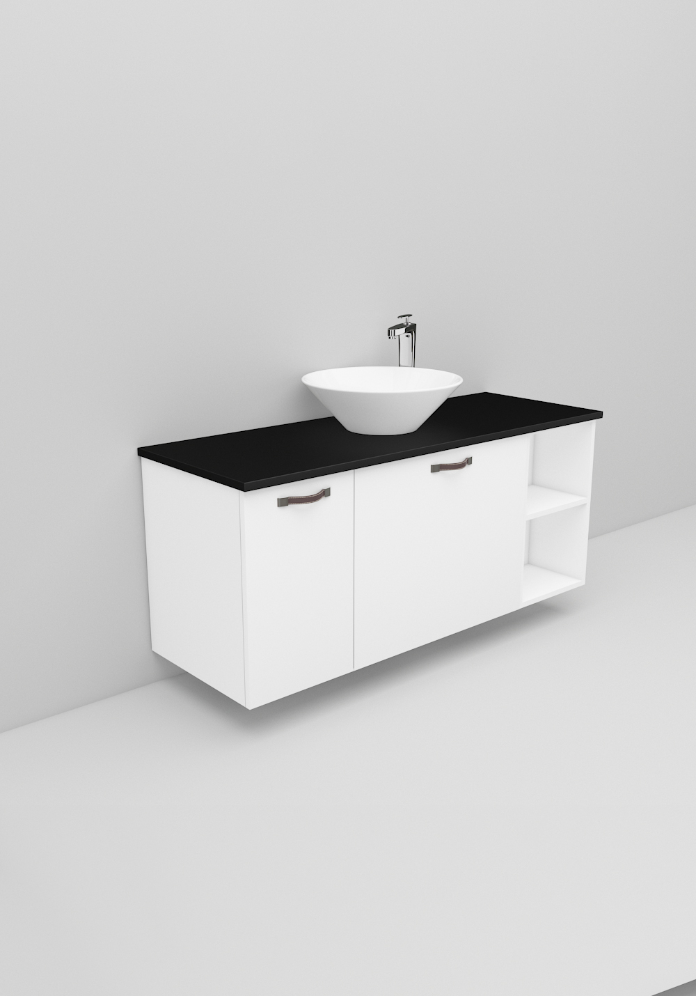 Flexline är badrumsmöbler med tidlös design och många valmöjligheter. Möblerna finns i varianter med både luckor och lådor med Soft Close-funktion, i bredder 600, 900 och 1200 mm och med flera olika utföranden på fronterna som sätter prägel på din möbel. Lyxigt fristående handfat på bänkskiva i Solid Surface marmor eller svart bänkskiva ingår. Köp till handtag, blandare, bottenventil och vattenlås.