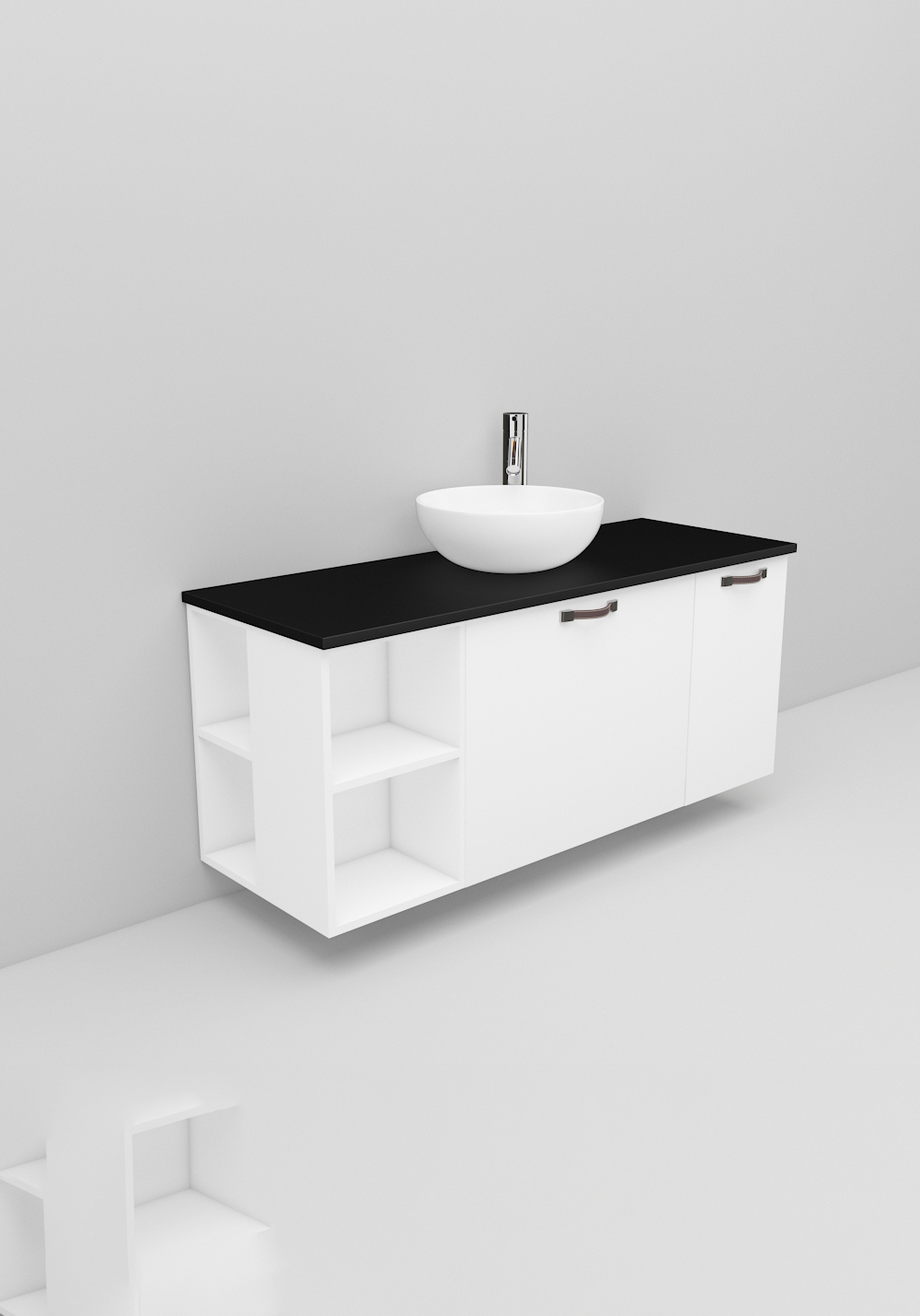 Flexline är badrumsmöbler med tidlös design och många valmöjligheter. Möblerna finns i varianter med både luckor och lådor med Soft Close-funktion, i bredder 600, 900 och 1200 mm och med flera olika utföranden på fronterna som sätter prägel på din möbel. Lyxigt fristående handfat på bänkskiva i Solid Surface marmor eller svart bänkskiva ingår. Köp till handtag, blandare, bottenventil och vattenlås.