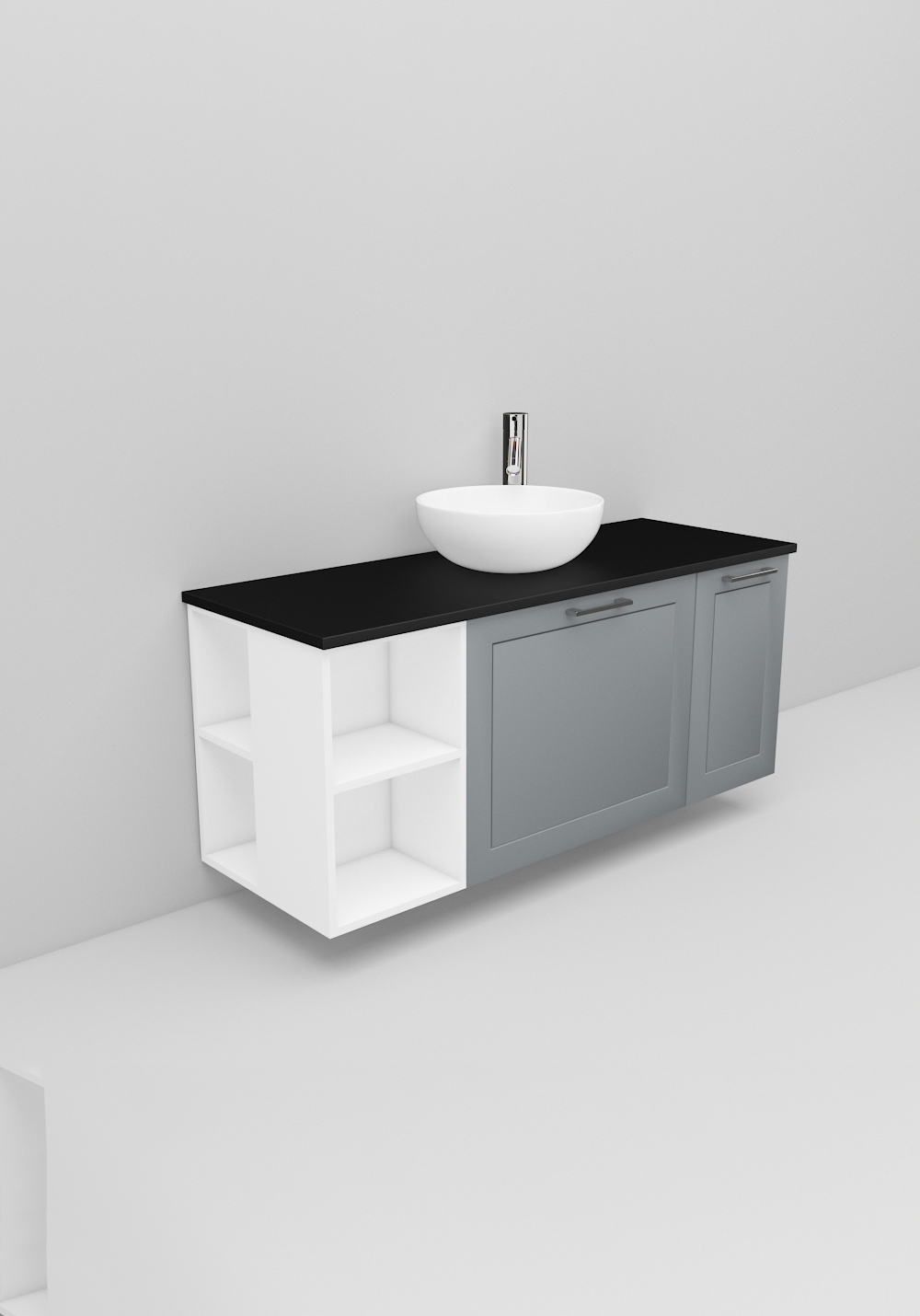 Flexline är badrumsmöbler med tidlös design och många valmöjligheter. Möblerna finns i varianter med både luckor och lådor med Soft Close-funktion, i bredder 600, 900 och 1200 mm och med flera olika utföranden på fronterna som sätter prägel på din möbel. Lyxigt fristående handfat på bänkskiva i Solid Surface marmor eller svart bänkskiva ingår. Köp till handtag, blandare, bottenventil och vattenlås.