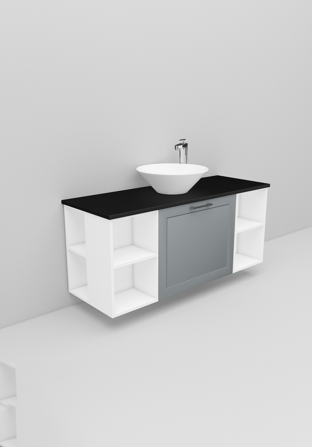 Flexline är badrumsmöbler med tidlös design och många valmöjligheter. Möblerna finns i varianter med både luckor och lådor med Soft Close-funktion, i bredder 600, 900 och 1200 mm och med flera olika utföranden på fronterna som sätter prägel på din möbel. Lyxigt fristående handfat på bänkskiva i Solid Surface marmor eller svart bänkskiva ingår. Köp till handtag, blandare, bottenventil och vattenlås.