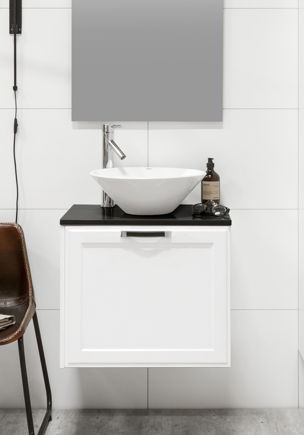 Flexline är badrumsmöbler med tidlös design och många valmöjligheter. Möblerna finns i varianter med både luckor och lådor med Soft Close-funktion, i bredder 600, 900 och 1200 mm och med flera olika utföranden på fronterna som sätter prägel på din möbel. Lyxigt fristående handfat på bänkskiva i Solid Surface marmor eller svart bänkskiva ingår. Köp till handtag, blandare, bottenventil och vattenlås.