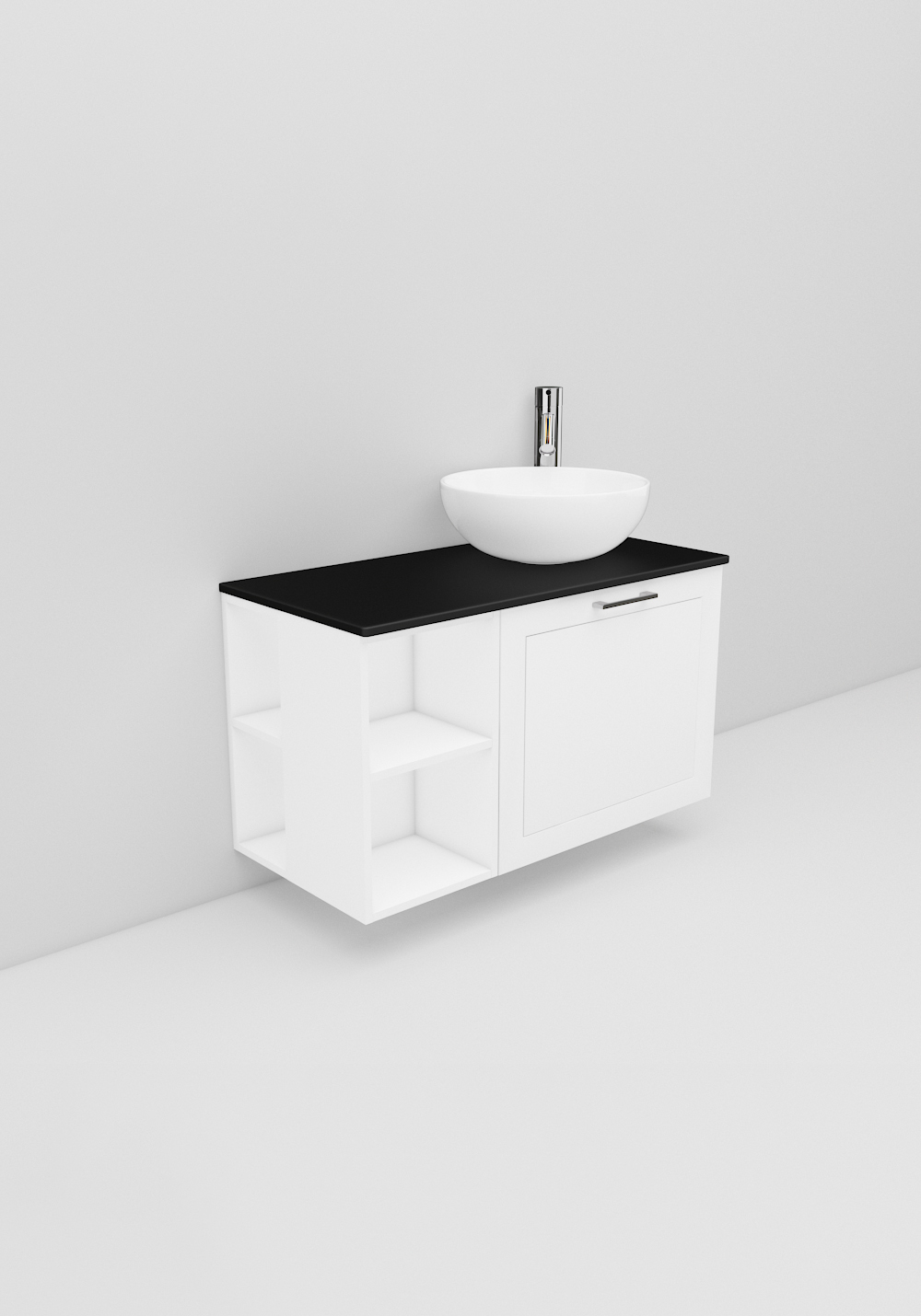 Flexline är badrumsmöbler med tidlös design och många valmöjligheter. Möblerna finns i varianter med både luckor och lådor med Soft Close-funktion, i bredder 600, 900 och 1200 mm och med flera olika utföranden på fronterna som sätter prägel på din möbel. Lyxigt fristående handfat på bänkskiva i Solid Surface marmor eller svart bänkskiva ingår. Köp till handtag, blandare, bottenventil och vattenlås.
