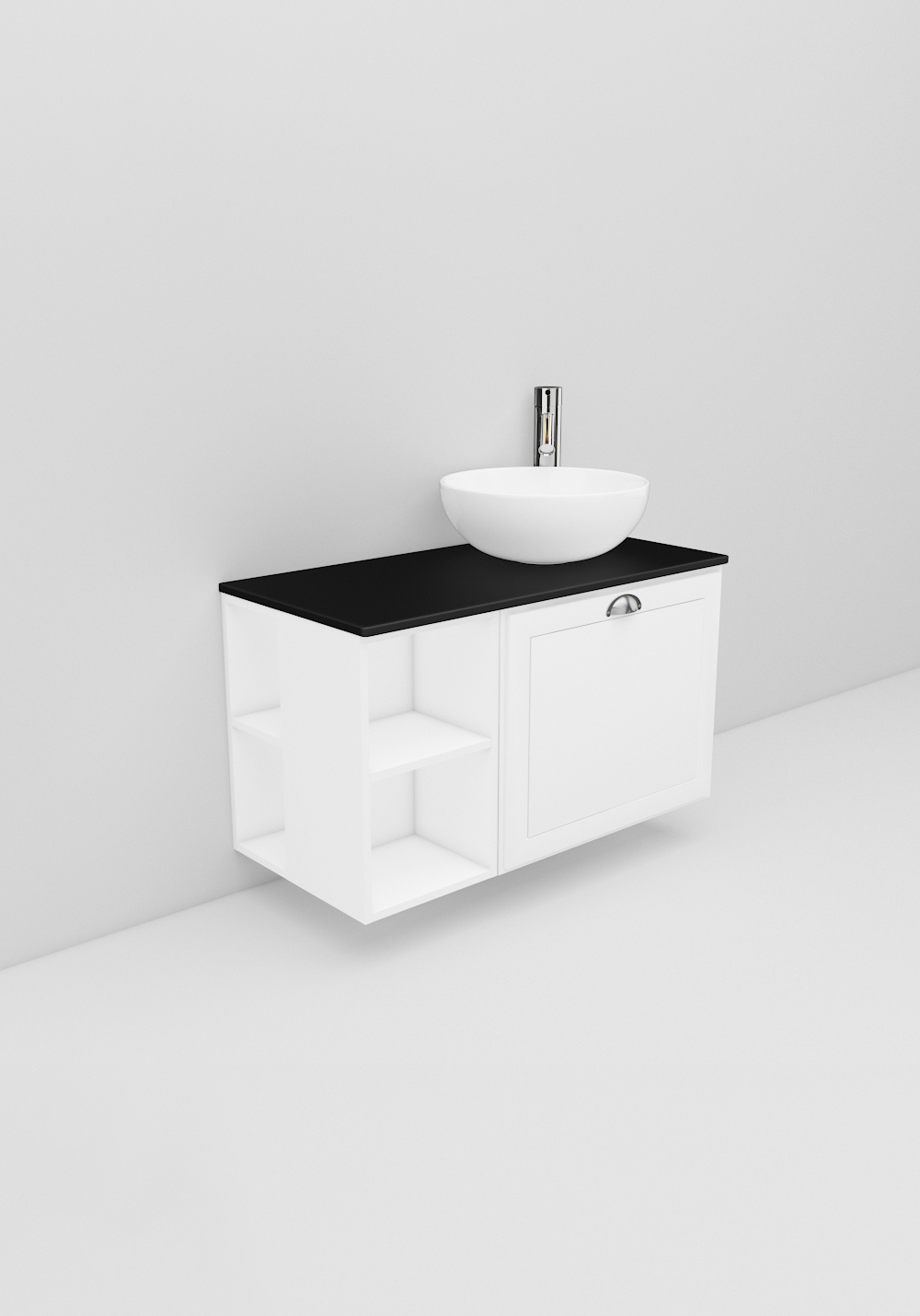 Flexline är badrumsmöbler med tidlös design och många valmöjligheter. Möblerna finns i varianter med både luckor och lådor med Soft Close-funktion, i bredder 600, 900 och 1200 mm och med flera olika utföranden på fronterna som sätter prägel på din möbel. Lyxigt fristående handfat på bänkskiva i Solid Surface marmor eller svart bänkskiva ingår. Köp till handtag, blandare, bottenventil och vattenlås.