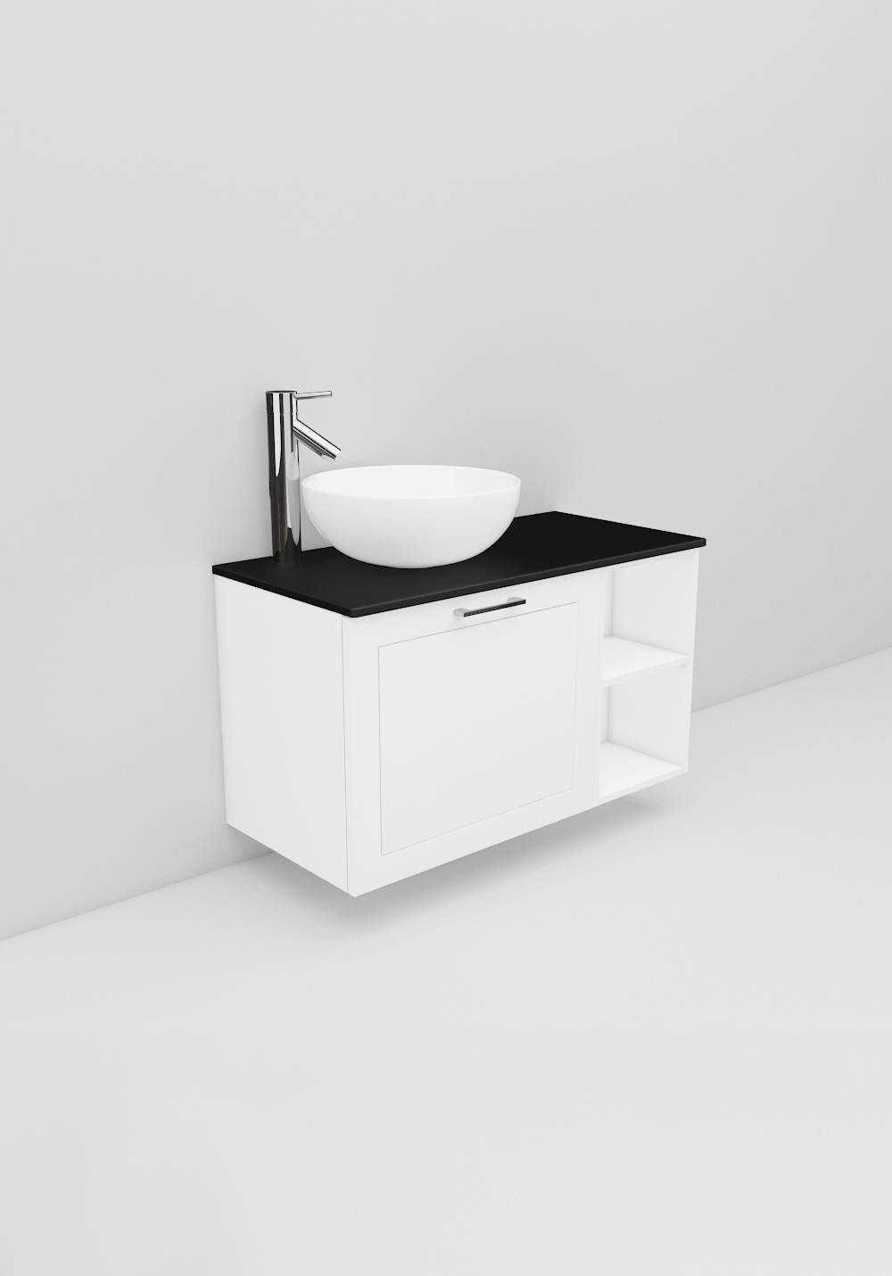 Flexline är badrumsmöbler med tidlös design och många valmöjligheter. Möblerna finns i varianter med både luckor och lådor med Soft Close-funktion, i bredder 600, 900 och 1200 mm och med flera olika utföranden på fronterna som sätter prägel på din möbel. Lyxigt fristående handfat på bänkskiva i Solid Surface marmor eller svart bänkskiva ingår. Köp till handtag, blandare, bottenventil och vattenlås.