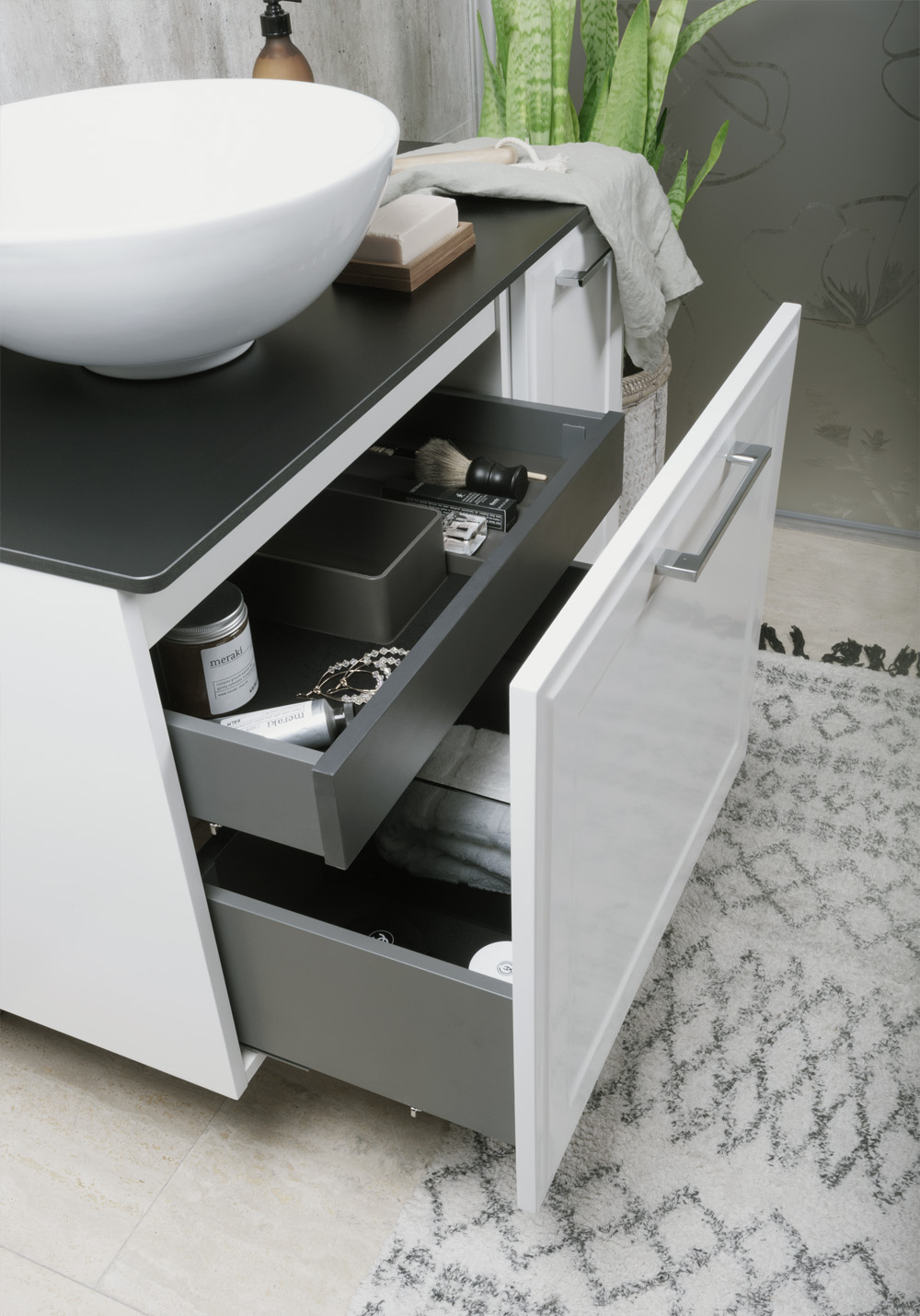 Flexline är badrumsmöbler med tidlös design och många valmöjligheter. Möblerna finns i varianter med både luckor och lådor med Soft Close-funktion, i bredder 600, 900 och 1200 mm och med flera olika utföranden på fronterna som sätter prägel på din möbel. Lyxigt fristående handfat på bänkskiva i Solid Surface marmor eller svart bänkskiva ingår. Köp till handtag, blandare, bottenventil och vattenlås.
