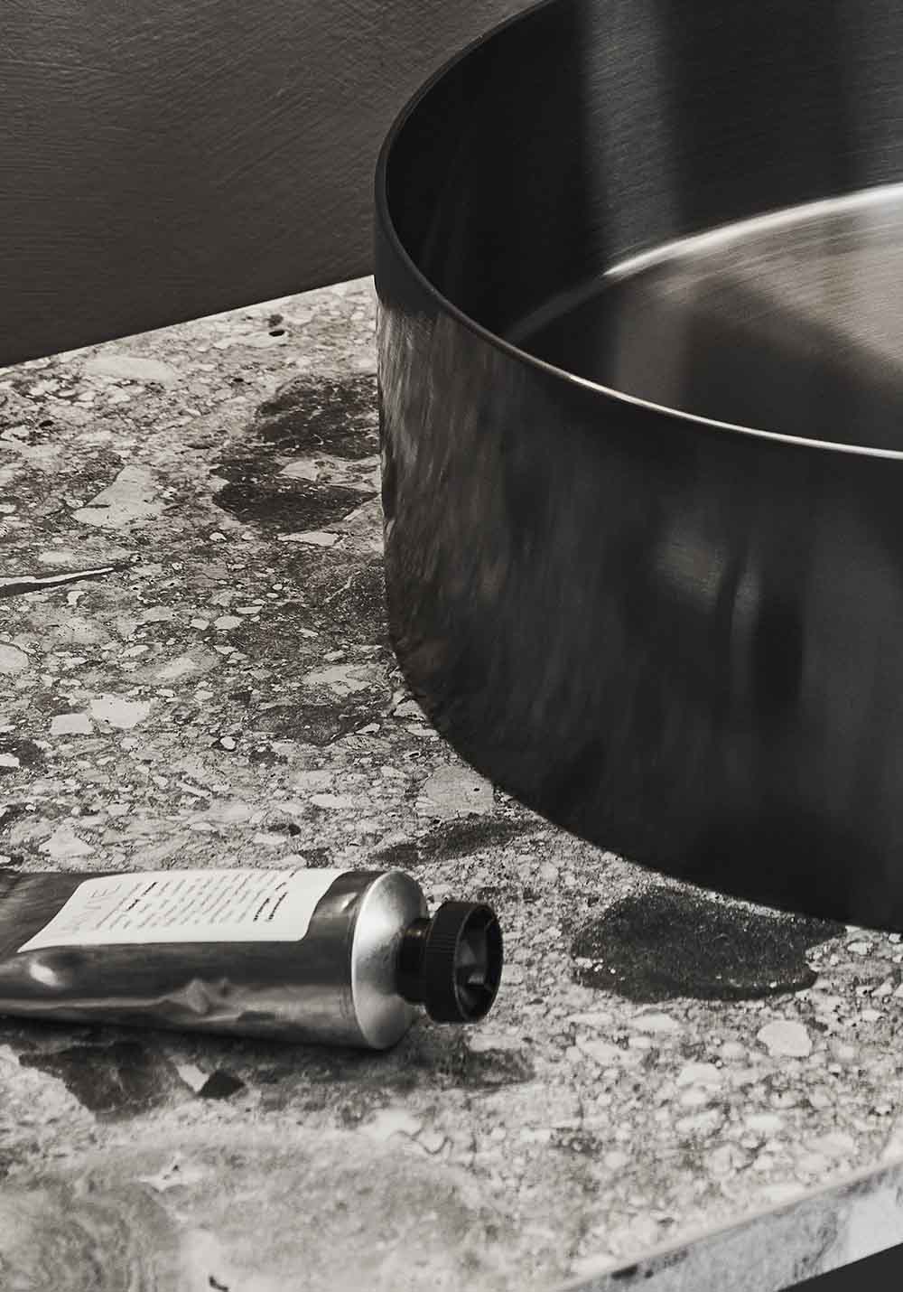 OnTop bänkskivor av laminat. Grått terazzomönster. Håltagning utförs av installatören beroende på blandare, handfatsmodell och och val av placering.
