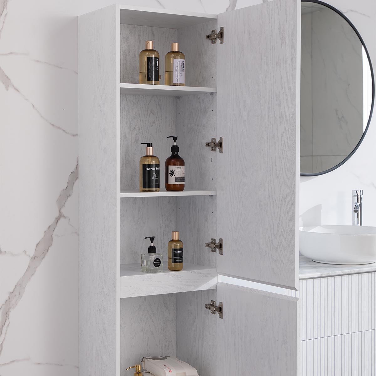 Sidoskåp som tillhör Bathlifes möbelserie Förtjust. Sidoskåpet har spårade luckor i lackerad ekfaner. Lacken ger möbeln ett bra fuktmotstånd. Detta skåp är ett snyggt komplement till Förtjust tvättställsskåp. Möbeln levereras färdigmonterad