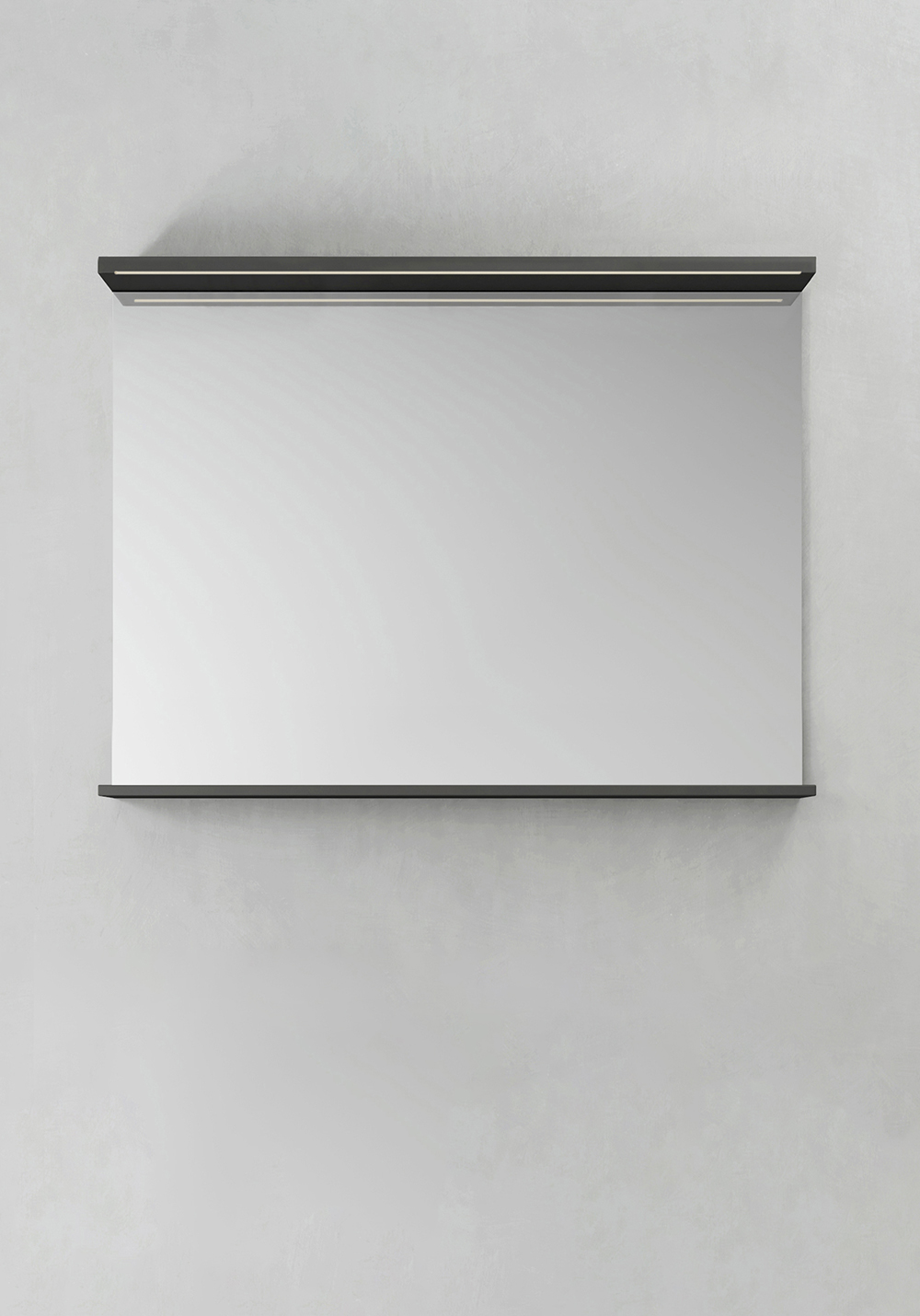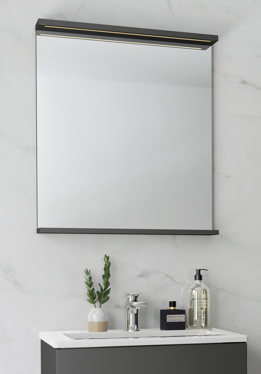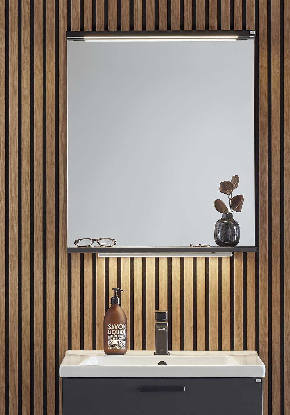 Spegel med funktionell belysning med infälld LED-profil eller LED-spots med varmvitt ljus. Praktisk hylla för avställning. Enkel installation för en person med justerbara upphängningsbeslag. Förberett för enkel el-installation. IP24.