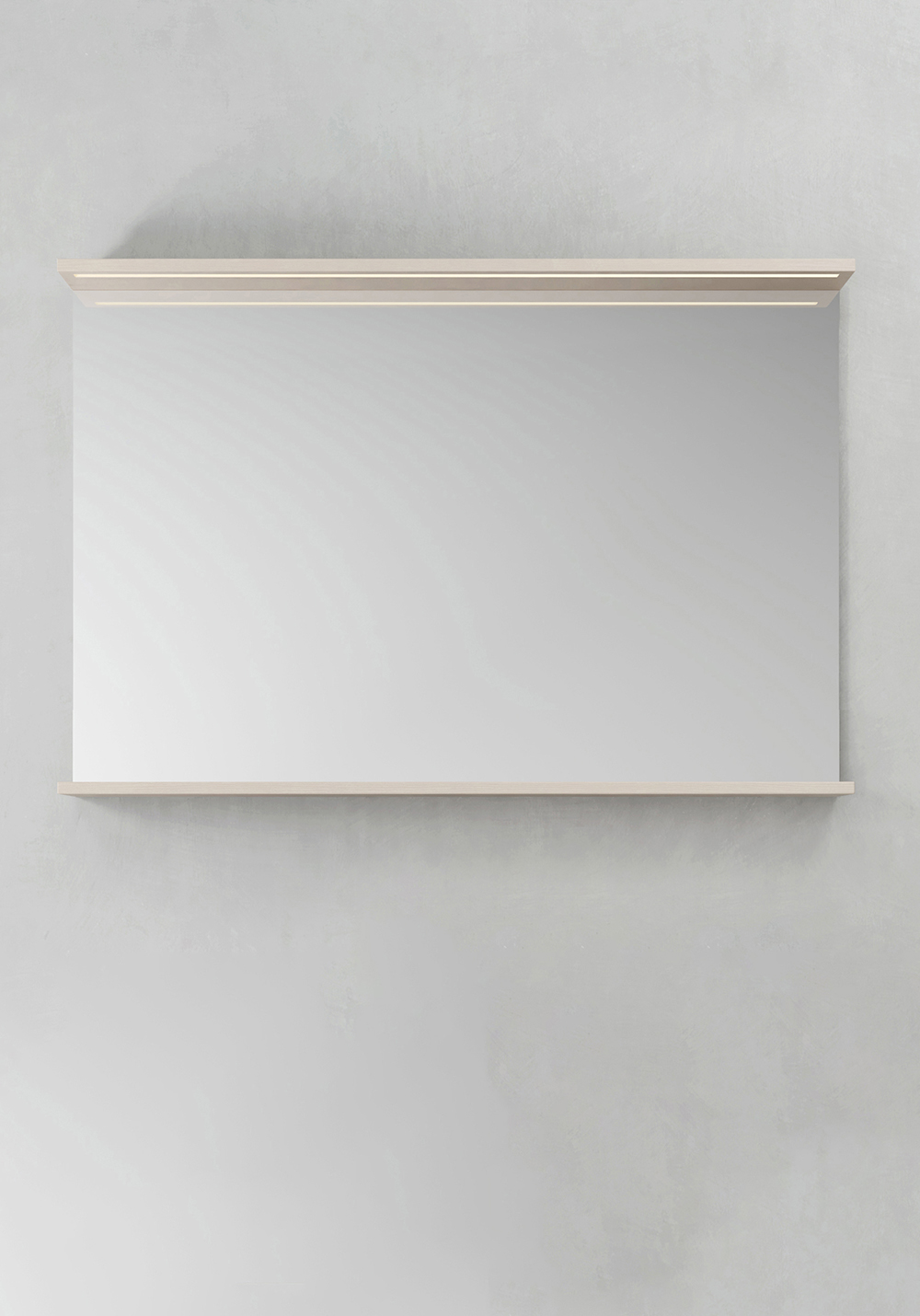 Spegel med funktionell belysning med infälld LED-profil eller LED-spots med varmvitt ljus. Praktisk hylla för avställning. Enkel installation för en person med justerbara upphängningsbeslag. Förberett för enkel el-installation. IP24.