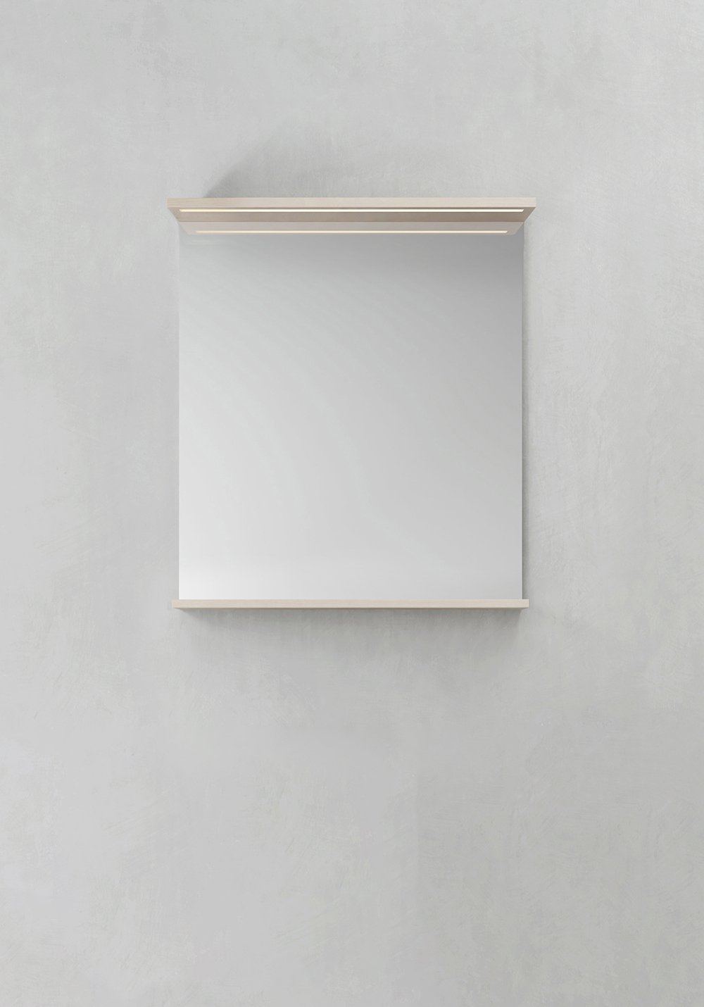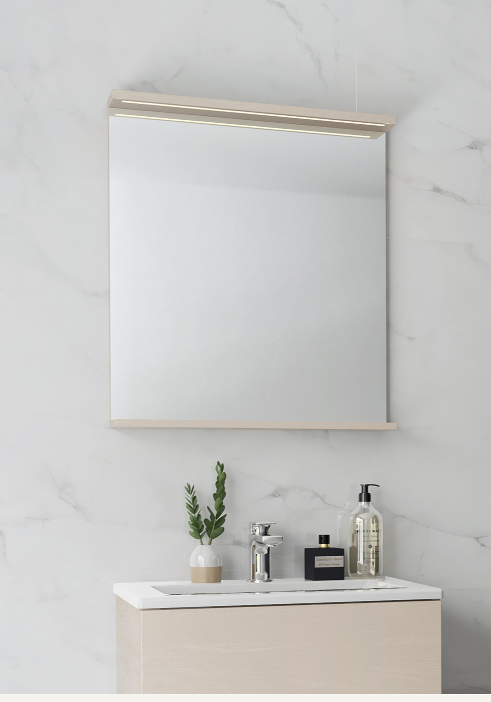 Spegel med funktionell belysning med infälld LED-profil eller LED-spots med varmvitt ljus. Praktisk hylla för avställning. Enkel installation för en person med justerbara upphängningsbeslag. Förberett för enkel el-installation. IP24