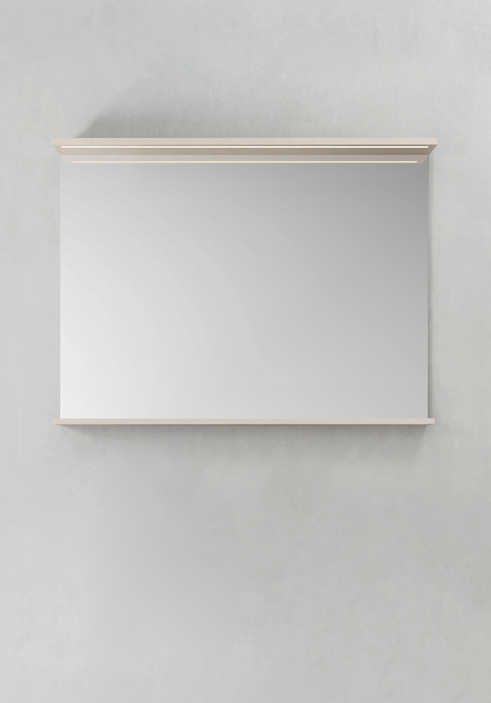 Spegel med funktionell belysning med infälld LED-profil eller LED-spots med varmvitt ljus. Praktisk hylla för avställning. Enkel installation för en person med justerbara upphängningsbeslag. Förberett för enkel el-installation. IP24.