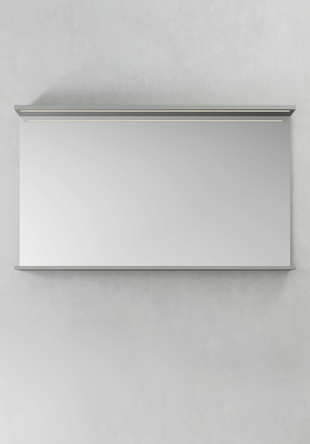 Spegel med funktionell belysning med infälld LED-profil eller LED-spots med varmvitt ljus. Praktisk hylla för avställning. Enkel installation för en person med justerbara upphängningsbeslag. Förberett för enkel el-installation. IP24.