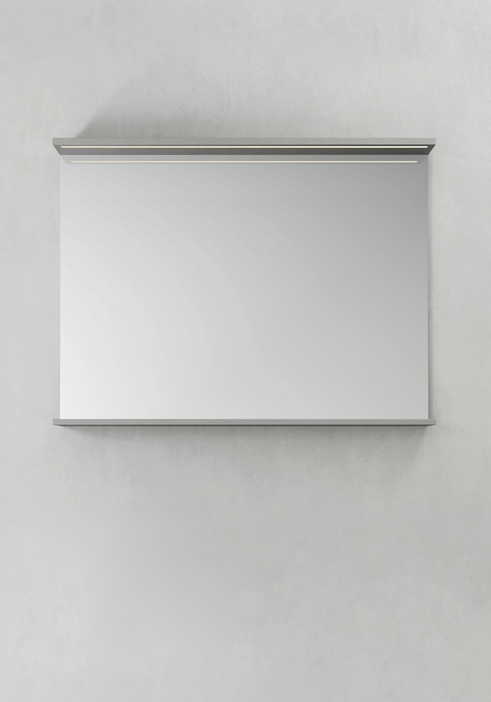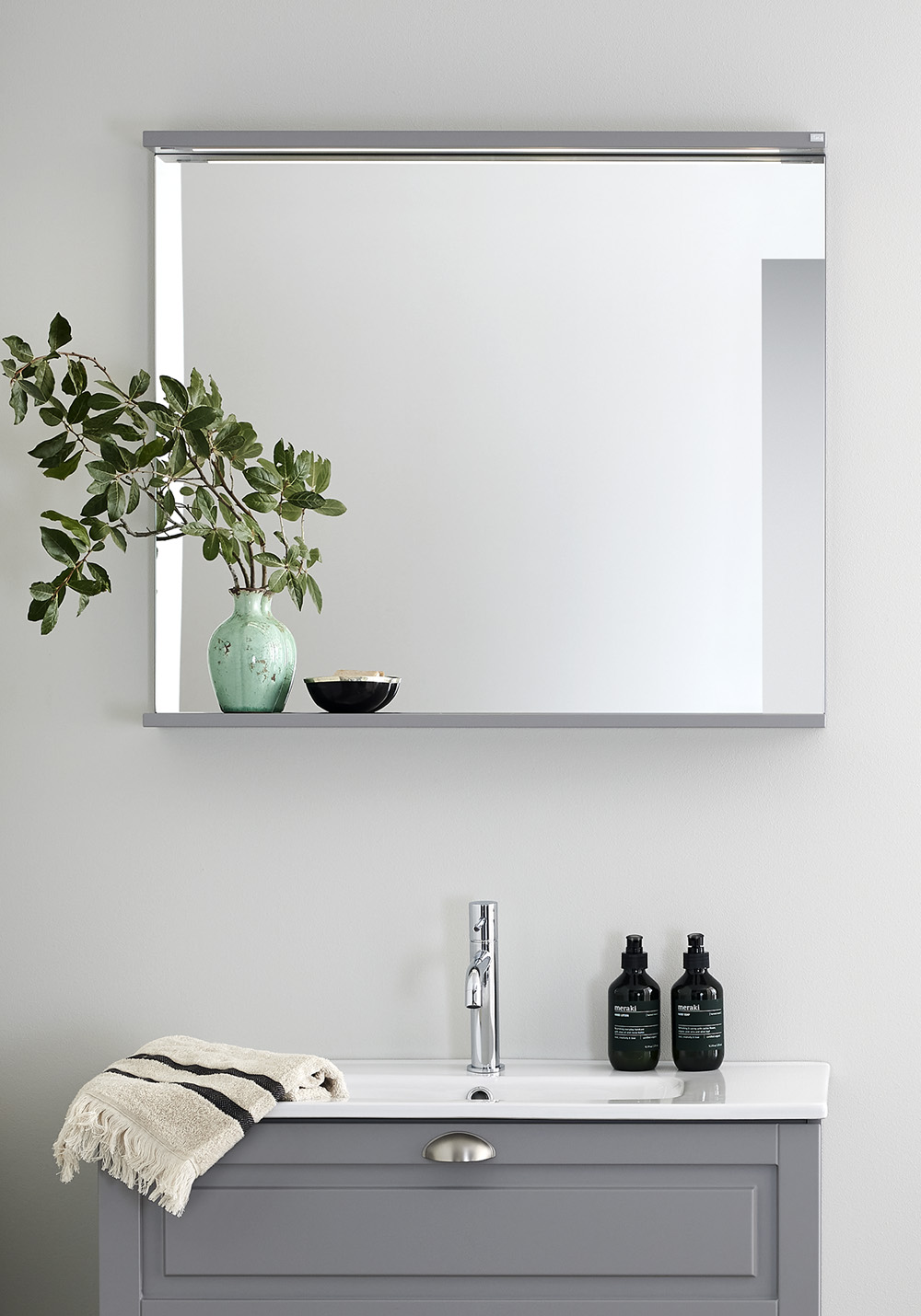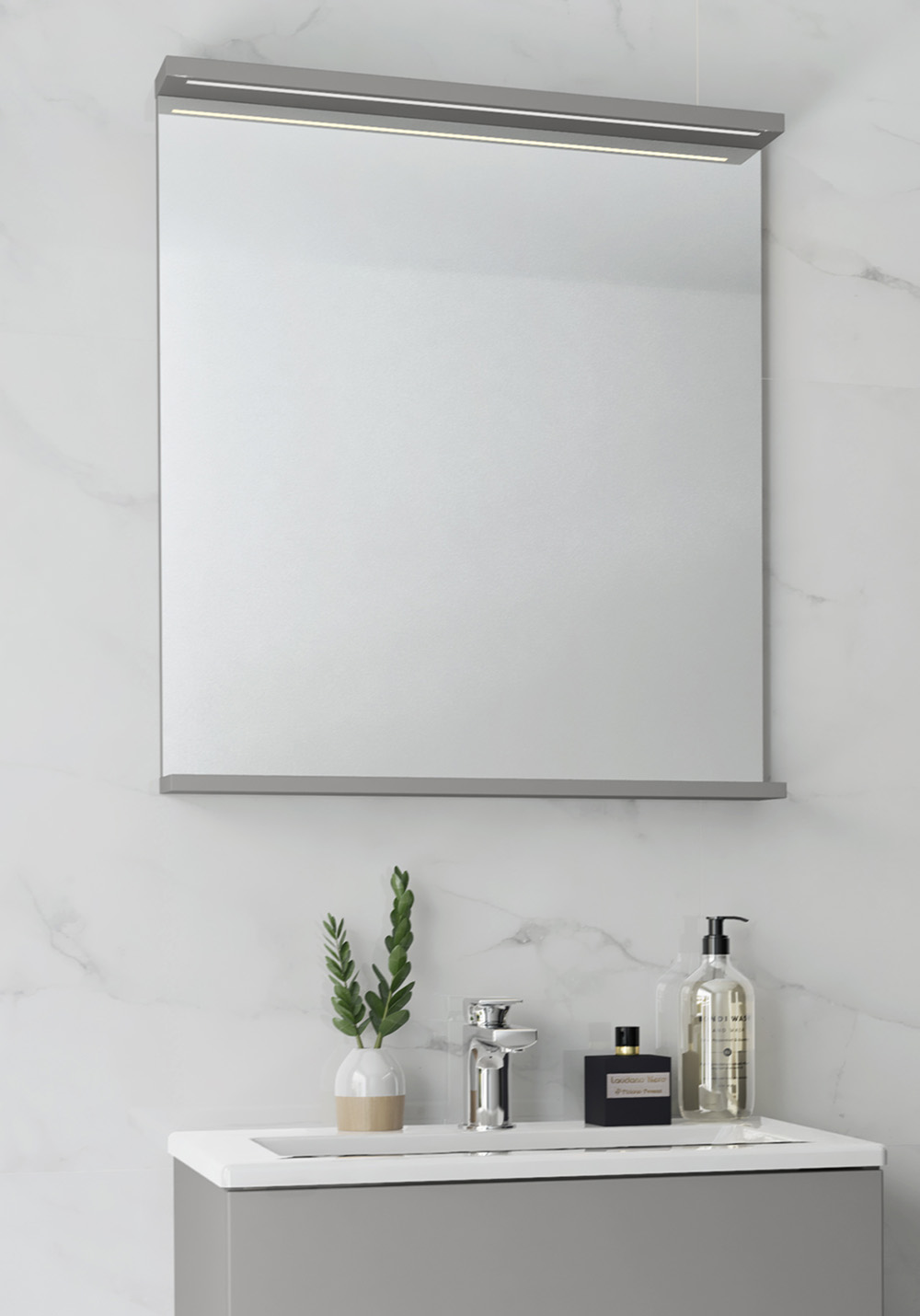 Spegel med funktionell belysning med infälld LED-profil eller LED-spots med varmvitt ljus. Praktisk hylla för avställning. Enkel installation för en person med justerbara upphängningsbeslag. Förberett för enkel el-installation. IP24.