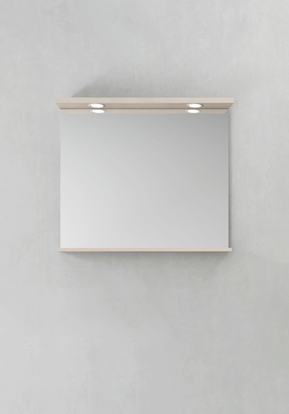 Spegel med funktionell belysning med infälld LED-profil eller LED-spots med varmvitt ljus. Praktisk hylla för avställning. Enkel installation för en person med justerbara upphängningsbeslag. Förberett för enkel el-installation. IP24.