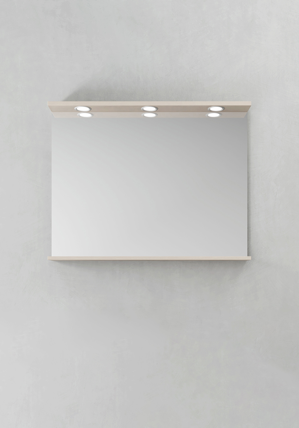 Spegel med funktionell belysning med infälld LED-profil eller LED-spots med varmvitt ljus. Praktisk hylla för avställning. Enkel installation för en person med justerbara upphängningsbeslag. Förberett för enkel el-installation. IP24.