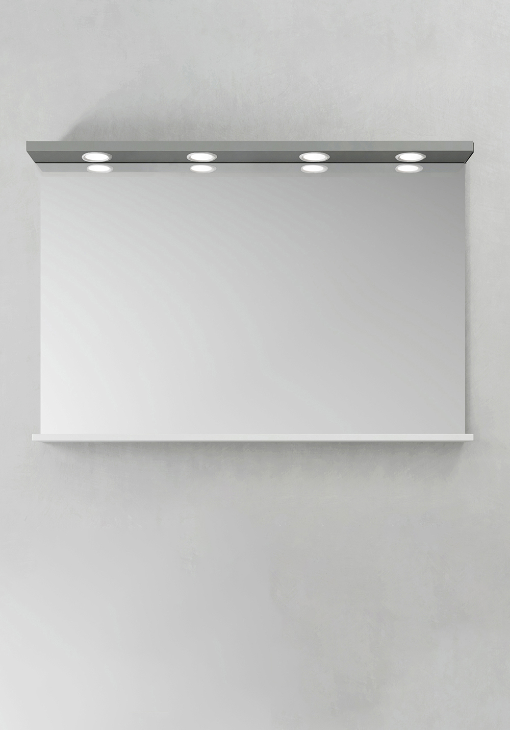 Spegel med funktionell belysning med infälld LED-profil eller LED-spots med varmvitt ljus. Praktisk hylla för avställning. Enkel installation för en person med justerbara upphängningsbeslag. Förberett för enkel el-installation. IP24.