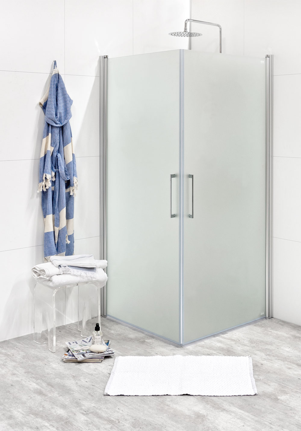 Avskalade och estetiska duschar för finsmakaren. Duschen finns i klarglas, frostat glas och sotat glas med silvermatt profil. Duschhörna med 5mm säkerhetsglas och 180° svängbara dörrar. Klarar utvändig rördragning upp till 35mm från vägg. Handtag ingår. Duschen är vändbar.