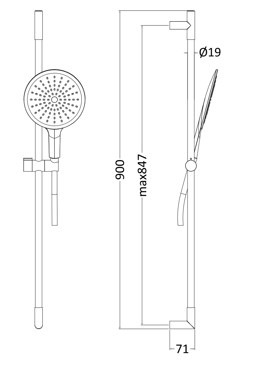 Duschset i krom och svart med duschstång i metall. Svart duschslang med AntiTwist och extra stort duschhandtag Ø 170. Duschstång med justerbara väggfästen 350-847 mm. Duschsetet innehåller tvålkopp.